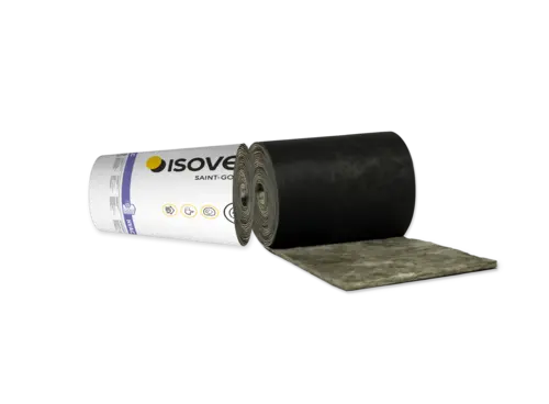 Rollo de lana mineral arena de ISOVER, revestido por una de sus caras con un tejido neto de vidrio reforzado de color negro de